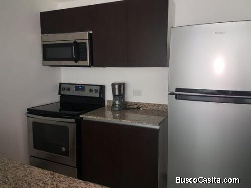 Completamente Amoblado. Ubicado en Piso#4 cuenta con 2 habitaciones, la habitación principal con baño, closets, 1 baño completo para visitas, acabados de lujo, cuarto de pilas con centro de lavado, cocina equipada, sobres de granito, horno, refrigeradora, mejane completo, sala-comedor, 1 espacio de estacionamiento, excelente vista al área de la piscina. Concepto 100% ecológico