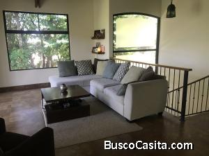 Amplia, iluminada y moderna casa estilo rustico, rodeada de naturaleza con techo a doble altura artesonados en madera chicle. Cuenta con un dormitorio en la planta principal con sanitario privado. Área social bordeada por balcón en forma de L y terraza para BBQ. Área de dormitorios en un nivel inferior, cada dormitorio con sanitario privado. Dormitorio principal con walkin closet y acceso al patio