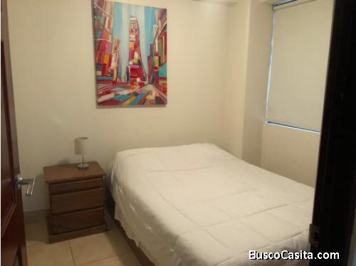Completamente amoblado, Cuenta con 2 habitaciones, 1 baño, pisos cerámicos, 1 espacio de estacionamiento bajo techo, vigilancia en la urbanización donde se encuentra el inmueble. No se aceptan mascotas. $800 dólares mensuales: Incluye cable, internet, mantenimiento y vigilancia